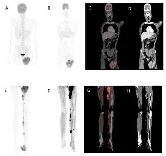A 32-year-old female, acral lentiginous melanoma resected from the left foot, presented with a recurrence and nodal metastases. Maximal intensity projection image (A), coronal 18F-FDG PET (B), fused (C) and CT (D) images demonstrating large inguinal node metastases. Maximal intensity projection image (E), Coronal 18F-FDG PET of lower limbs (F), fused (G) and CT (H) images demonstrating left foot primary with subcutaneous and nodal metastases in the left leg. MTV 126.73 cm3, TLG 567.75, SUVmax 10.78, whole-body MTV 635.48 cm3 and whole-body TLG 9964.33. Overall survival was 8 months.