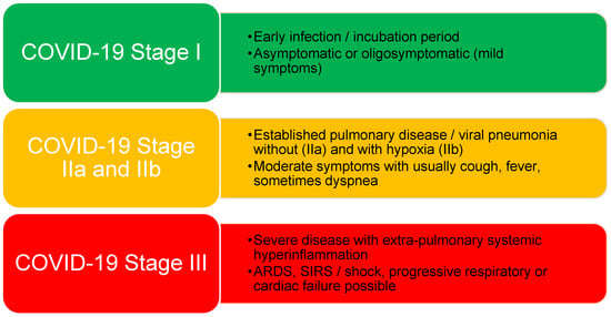 The score was retrospectively applied to consecutively hospitalized SARS-CoV-2-positive patients from 22 November 2020 until 17 February 2021 that were treated at the City Hospital Zurich Triemli (Stadtspital Zürich Triemli) during the second wave of the COVID-19 pandemic in Switzerland. The Department of Internal Medicine of the Triemli Hospital agreed to participate as an external partner to apply the AIFELL score in a different hospital location than where it was initially developed. Patients were either admitted through the emergency rooms (ER) from an outpatient setting or directly to the medical ward or the ICU from other hospitals in the area around Zurich (Switzerland). SARS-CoV-2 swabs for qPCR analyses were either performed in the ER of the Triemli Hospital or by the hospitals and outpatient clinics who referred the patients for further treatment. Inclusion criteria were a positive SARS-CoV-2 swab result analyzed using qPCR at admission, a blood sample available upon admission, including at least two of the three considered laboratory parameters (CRP, LDH and total lymphocyte count), chest imaging (X-ray or computed tomography of the thorax) and documented body temperature. Declaration of consent for the use of health-related data and samples for research purposes was signed by every patient. Exclusion criteria were patients with fewer than two laboratory parameters available and missing chest imaging or documentation of body temperature. In addition, patients were excluded if COVID-19 was not the main reason for hospitalization in order to prevent bias regarding laboratory values. AIFELL scores were calculated for each patient at hospital admission, as described in our previous publication []. Due to varying reference ranges for LDH between different hospitals, the original protocol was slightly modified and the LDH limit was defined as the 85th percentile of the maximum value of the LDH reference range, as originally observed in the pilot population at the University Hospital Zurich. Non-measurable LDH results due to hemolysis were also considered to be elevated, which is in line with the fact that hemolysis has been reported to be associated with COVID-19 [,]. Since patients with fever often take antipyretic medications before seeing a physician or presenting at the emergency room, attention was paid to history of fever during the last 3 days before hospital admission, and the highest value measured was taken into account. COVID-19 stages according to Siddiqi and Mehra [] were assigned based on medical records at hospital admission and in the course, especially at disease deterioration. This classification was chosen because the authors suggested specific therapeutic approaches for each stage []. Important criteria defining disease stages are described in Figure 1. The initial and the maximum stage during hospitalization were documented to evaluate disease progression. The study was approved by the Institutional Review Board of the Canton of Zurich (Cantonal Ethics Committee, Nr. 2020-03036).