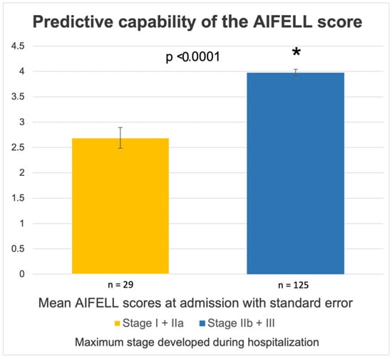 AIFELL scores ≥3 points at admission were associated with development to more severe disease stages (II and III) during the hospital stay, needing a more intensive therapeutic approach (i.e., intermediate or intensive care units). Patients needing oxygen supplementation due to hypoxia during hospitalization (COVID-19 stage IIb and III, n = 125) had significantly higher AIFELL scores at admission (3.98 ± 0.75) compared to patients who maximally developed COVID-19 stages I and IIa (2.69 ± 1.11, p < 0.0001), as shown in Figure 2.