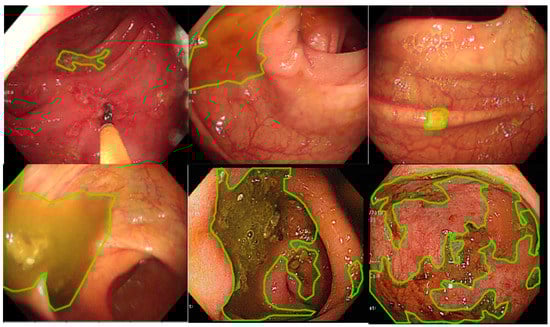 LabelMe (https://github.com/wkentaro/labelme, accessed on 1 October 2021), an annotation tool for executing image segmentation, is an open-source software and has been widely applied to perform image annotation tasks. The software was installed on a Windows system, and 3 senior endoscopic technicians were trained to perform endoscopy image segmentation labeling (Figure 1). The images show the areas where staining, residual stool, and/or opaque liquid, which influenced the visualization of mucosa, were marked for segmentation []. After the annotation, another senior technician rechecked the images to ensure labeling quality. When facing difficulty in image labeling, an experienced endoscopist (Wang YP) was consulted to make the final decision. All images with discernible information were removed and given a random serial number for subsequent model use.