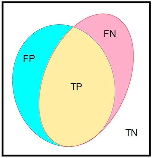 An independent dataset was selected for the verification of the best-established training model. The concept of a confusion matrix was applied to verify the performance of our trained AI model. In our image, the manually marked mucosal area coated by fecal residue was set as the ground truth, which was defined as the union area of false negative (FN) and true positive (TP) (Figure 3). The AI model-predicted area, i.e., the automated segmentation of fecal residue-covered mucosa, involved both the TP and false positive (FP). The intersection area of the ground truth and AI-predicted area was the TP. The area outside of the union of the ground truth and the AI-predicted area was defined as the true negative (TN). Accuracy was calculated as the addition of TP plus TN in proportion to the total mucosal area and was used to represent the performance of our AI model. The defined parameters are given in the following equations: