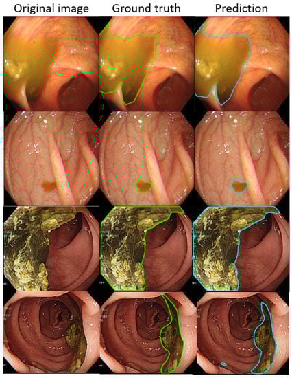 In recent years, with the application of artificial intelligence (AI), computer-aided detection and diagnosis software systems have been developed to help endoscopists enhance and characterize polyps during colonoscopy [,,,]. AI and machine learning techniques have also emerged to evaluate the quality of bowel preparation. Two previous studies explored the evaluation of bowel cleanliness in capsule endoscopy and colonoscopy [,]. These applied AI to classify bowel cleanliness based on experts’ subjective grading. With this approach, human factors can still lead to potential bias in scoring due to the fair interobserver reliability of the grading scales used in these reports (capsule endoscopy, ICC = 0.37–0.66; colonoscopy, weighted kappa of 0.67–0.78 with BBPS). In our current study, we used a completely different approach by using a segmentation method to precisely label fecal material in the training dataset. With this method, we attempted to develop a fully automatic segmentation method through the application of convolutional neural networks (CNNs) to mark the mucosal area coated with fecal material using prospectively collected colonoscopy video imaging data. The proposed model can be a useful and novel tool for objectively evaluating the quality of colon preparation. To achieve this goal, we used U-Net, an AI architecture that focuses on biological images, as the backbone in the process []. The U-Net architecture won the 2015 International Symposium on Biomedical Imaging (ISBI) cell tracking challenge and is often used for brain tumor cutting [], retinal image segmentation [,], endoscopy image segmentation [,], and other medical image segmentation tasks [,,].