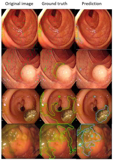 As shown in the Introduction, we chose U-Net as the core architecture because of its good performance. It may be argued that other architectures may perform better. For example, DeepLab achieved a higher IOU than U-Net in other reports [,,,,]. In the decode part, DeepLab would directly quadruple the encoder features as the output result [], while U-Net obtained the output result by repeating the up-sampling process four times []. Hence, U-Net can preserve more low-level features in the final output result. In our case, the fecal material in the image may be relatively small when compared to the entire image. Therefore, we suggest that U-Net may be able to detect more fecal materials, at greater detail, which is more suitable for our purpose. Recent research does suggest that there may be new lightweight encoder networks that may be able to achieve performance on par with the current available encoder with fewer samples while having faster image processing []. Future investigations comparing different backbones, especially the lightweight ones, may be necessary to further improve the accuracy and efficiency in AI-assisted fecal material detection during colonoscopy.