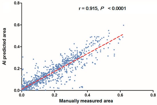 The obtained area in pixels was measured, and all the data are presented as the mean ± S.E.M. The number of pixels in the AI-predicted surface area coated by fecal residue was computed. The proportion of AI-predicted surface area coated by fecal residue against total mucosa area as the octagonal area in the image was also computed and displayed in real time. Pearson correlation and a two-sided t-test were used to evaluate the association of the proportion of labelled areas against total area between automatic and manual segmentation. All statistical tests were performed at the α < 0.05 level.