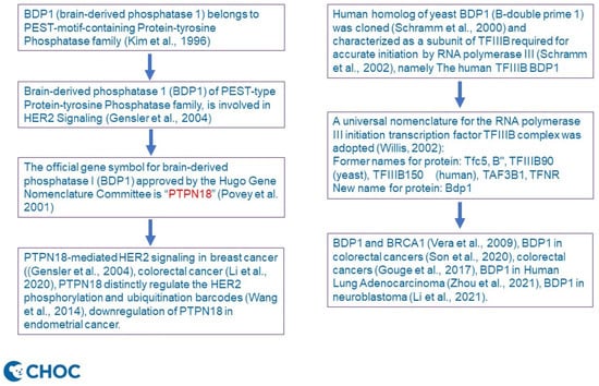 Given the above background, Professor Laura Schramm’s comment corrected our misquotation of breast cancer [12]. Gensler’s group worked on the PEST-type Protein-tyrosine Phosphatase BDP1, aka brain-derived phosphatase 1 (BDP1), initially [12] and was renamed to PTPN18 HGNC data (Refer to Gene symbol report | HUGO Gene Nomenclature Committee (genenames.org, accessed on 18 January 2022) [3,4]). To offer a clarification, we have drawn a schematic diagram (Figure 1) to illustrate the timeline of nomenclature and the difference between PTPN18 and BDP1 and their perspectives in cancer involvement, as per Professor Schramm’s suggestion. We noticed that there is functional overlap of both PTPN18 and BDP1 in colorectal cancer [9,13]. Uniquely, silencing of PTPN18 induced ferroptosis in endometrial cancer cells [14] through p-P38-mediated GPX4/xCT downregulation [15], while downregulation of PTPN18 can inhibit proliferation and metastasis and promote apoptosis of endometrial cancer [16]. All of these genes are yet to be elucidated for their therapeutic impacts in clinal studies.