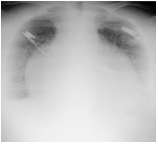 A chest X-ray revealed a significantly enlarged heart silhouette, signs of pulmonary congestion, and a small amount of fluid in both pleural cavities. (Figure 1).