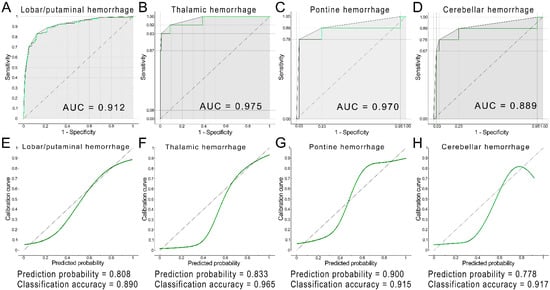 Area under the receiver operating characteristic curve of the nomogram for internal 5-fold cross-validation of death due to lobar/putaminal hemorrhage (A), thalamic hemorrhage (B), pontine hemorrhage (C), and cerebellar hemorrhage (D). Calibration curve of nomograms for the predicted probability of death due to lobar/putaminal hemorrhage (E), thalamic hemorrhage (F), pontine hemorrhage (G), and cerebellar hemorrhage (H). AUC, area under the curve.