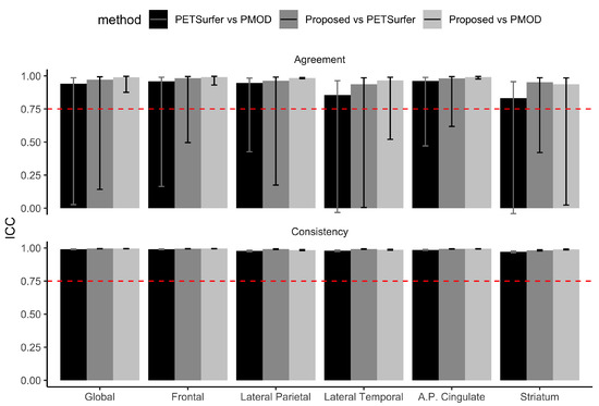 Figure 2. Intraclass correlation for PETSurfer, PMOD, and the proposed method. Dashed line shows that the ICC value is 0.75.