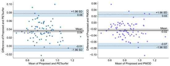 Figure 4. Bland–Altman plot of the proposed method, PETSurfer, and PMOD in the global region of amyloidosis-negative subjects.