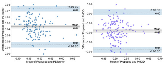 Bland–Altman plot: The Bland–Altman plots are visualized in Figure 3 and Figure 4. As shown on the left of Figure 3 for negative subjects, the mean difference between the proposed method and PETSurfer was 0.04 (95% limits of agreement; LOA: −0.01, 0.08). For the results of the proposed method and PMOD, the mean difference was −0.02 (95% LOA: −0.07, 0.03). Regarding the positive subjects in Figure 4, the mean difference between the proposed method and PETSurfer in the left plot of the figure is 0.04 (95% LOA: 0.01, 0.07). On the other hand, the mean difference between the proposed method and PMOD is −0.02 (95% LOA: −0.04, 0.00). All regions of the Bland–Altman plot are represented in Figure A1, Figure A2, Figure A3 and Figure A4.