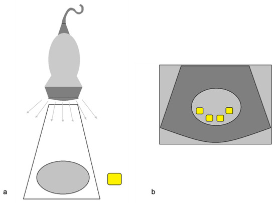 The side lobe artifact. (a) Diagram shows multiple beams outside the main US axis encountering an object (yellow box); (b) The display assumes that the return echoes that come from outside the main axis are mistakenly understood as coming from the main axis itself, and therefore misplaces and duplicates the structure (multiple yellow boxes) in the context of the target image. Modified from Feldman MK et al. [5].
