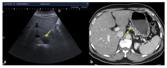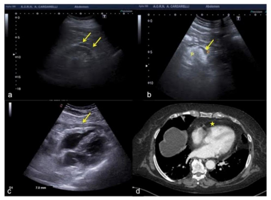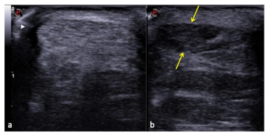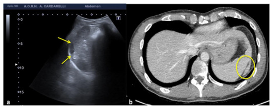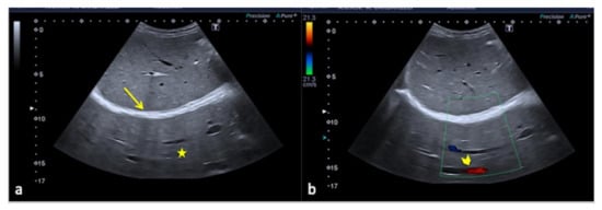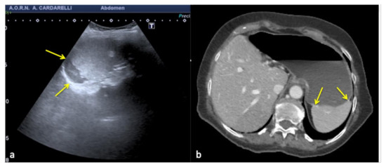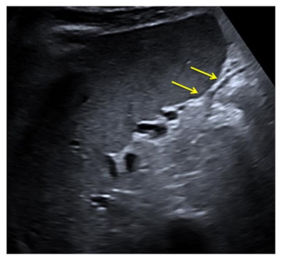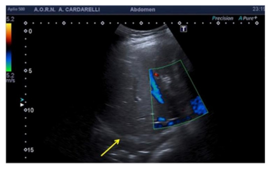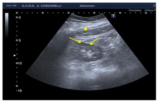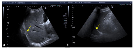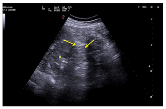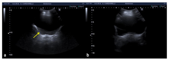 An example is given by the “pseudo-mud” which is observed at the bottom of the bladder or in the gallbladder (Figure 2). In this case, the correct setting of the US image, the focusing and the use of multiple scans allow the image quality to be improved [5,6].