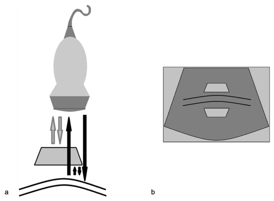 Because the US beam is reflected back and forth several times between two highly reflective parallel surfaces (“reverberates”), the US transducer interprets the reflected echoes as happening at deeper structures because they take longer to return to the transducer (Figure 10 and Figure 11) [3]. This very common mistake can be easily solved with a change of the angle of insonation in order to avoid the reverberation between strong parallel reflectors [5,6].