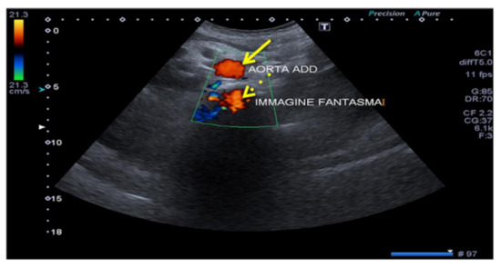 When the US of the primary incident beam passes through a curved interface with high specular reflection capacity (e.g., the diaphragm), the structure close to this interface can be reproduced on the US image both in its real position and in a symmetrical opposite position, beyond the reflecting surface (e.g., mirror image of the liver, which can be mistaken for a parenchymal consolidation, or the aorta, which can produce a “ghost image”) (Figure 3, Figure 4 and Figure 5). Mirror-image artifacts will disappear when the reflector is scanned with oblique orientation [5,6].