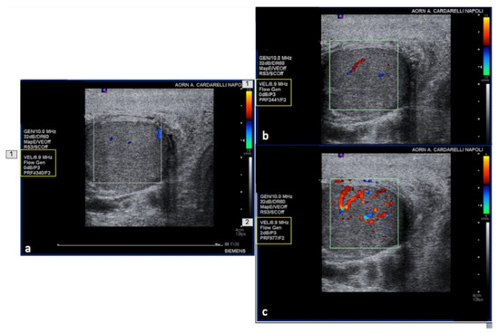 PRF setting. High- (a) middle- (b) and low- (c) PRF setting show progressive better evidence of intra-testicular flow at low setting (yellow box).