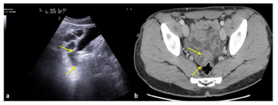 Longitudinal US pelvic scan (a) shows a small, triangular, hypoechoic area which may be misinterpreted as free fluid (arrows). On CT scan (b) it appears to be an intestinal loop (arrows).