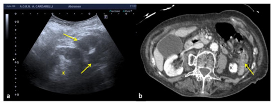 Coronal images of the left flank. Refraction of the US beam at the lower pole of the spleen causes apparent disruption of the of the middle third of the left kidney (arrows). K: kidney.