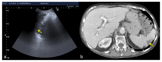 Subcostal US right approach (a) shows a hypo-anechoic elongated image (arrow) simulating a small right pleural effusion. Coronal US scan of the left hypochondrium (b) shows a mirror artifact that duplicates the image of the spleen (arrow) and mimics pleural effusion.