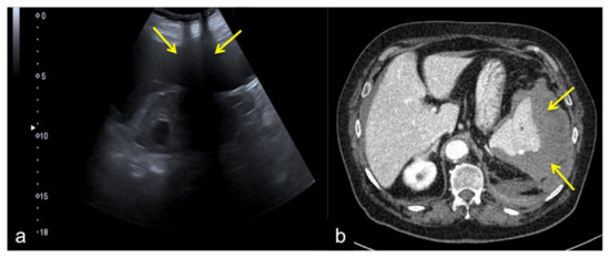 Coronal US scan of the left hypochondrium (a) is strongly influenced by the breakage of the probe crystals (arrows) and does not clearly show the large splenic hematoma. On CT scan (b) the splenic hematoma appears to be more evident (arrows).