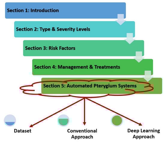This review paper is organized into six sections that start with a basic introduction to the pterygium condition. Then, the following Section 2 discusses the type and severity level of the pterygium condition, followed by risk factors for pterygium in Section 3. After considering the possible reasons for developing pterygium, Section 4 explains the management and treatment procedures of this condition, which are mainly divided into early and late stages. Section 5 summarizes the main state-of-the-art methods in automated pterygium screening systems for both classification and segmentation tasks, which are further divided into several subsections that include the dataset used to fit the model, conventional machine learning methodology, and deep learning techniques applied in the screening system. The final Section 6 concludes the paper, followed by a few suggestions on future research work to further improve the performance of a computer-assisted pterygium screening system. The general information flow of this paper is shown in Figure 2.