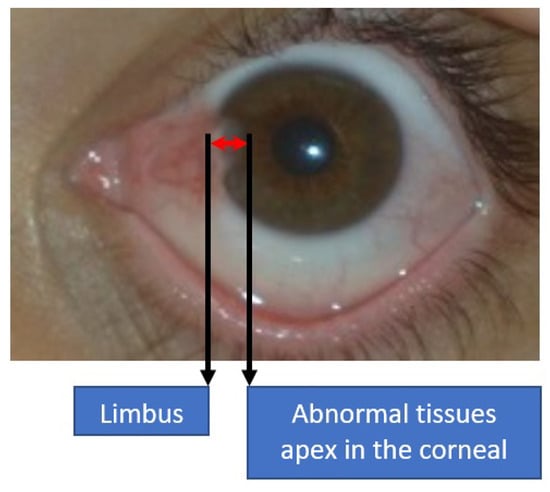 Generally, ophthalmologists have agreed that pterygium at the early stage is a minor concern, in which a short-term solution is usually advised through topical corticosteroid eye drops [2]. Therefore, a detailed history of the suspected pterygium patient will be analyzed first to identify any anomaly or other early indicators. It is important to distinguish the pterygium case from the ocular surface squamous neoplasia case, which can be distinguished through the period of the abnormal tissue growth [15]. At the early stage, precautions include ultraviolet-filtered sunglasses, lubricant eye drops, and anti-inflammatory eye drops. Meanwhile, for severe cases, surgery is the most viable option for treatment [16]. Some ophthalmologists will alert the patients if the pterygium tissues grow to more than 3 mm, which is the distance measured from the limbus to the apex of the corneal region, as shown in Figure 4. According to Aminlari et al. [17], three surgical procedures can be performed to remove the benign tissues, which include bare sclera excision, the conjunctival autograft technique, and amniotic membrane grafting. In [18], Janson and Sikder suggested additional three surgical procedures to treat pterygium, namely primary closure surgery, the conjunctival flap procedure, and a limbal conjunctival autograft.