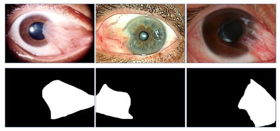 Abdani et al. [7] focused only on the segmentation dataset. The images were sourced from the full Australian Pterygium classification dataset, which was collected by Professor Lawrence Hirst from the Australian Pterygium Centre. The total number of images in this dataset is 328 anterior segment photograph images with their corresponding semantic segmentation ground truth. The label was manually traced by the medical and biomedical researchers, and it is saved in JPEG format. They have followed the annotation protocol from the 2017 Automated Cardiac Diagnosis Challenge: Segmentation [24], whereby the bio-medical researcher will trace the pterygium tissues’ outline first, before the final boundary is finalized together with the medical researcher. Only two semantic classes are considered, namely whether the pixel belongs to the pterygium class or not. The original resolution of 4064 × 2704 is reduced to 450 × 300, whereby the user can down-scale the resolution further, independently, according to the deep learning model requirement. GIMP2 version 2.10.14 with the pencil tool was used to trace the pterygium tissue boundary. This dataset also contains cases from various severity levels of pterygium, which include trace, mild, moderate, and severe cases. Some of the pterygium samples and their corresponding ground truth labels are shown in Figure 6.