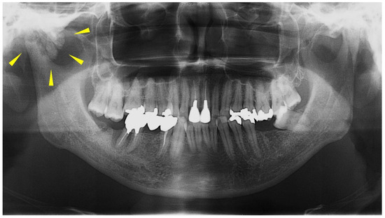 Panoramic radiograph from the first visit. The ill-defined calcification around the mandibular condyle is shown (yellow arrows).