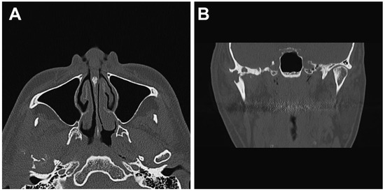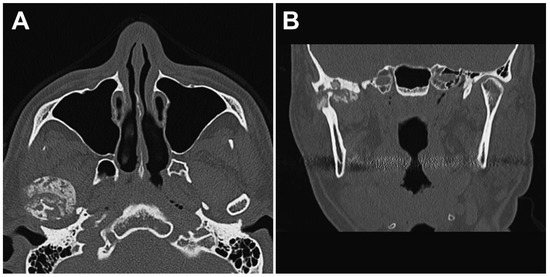 Postoperative computed tomography (CT) images. (A) Axial CT images and (B) Coronal CT images revealed that the masses were extracted from the right temporomandibular joint.