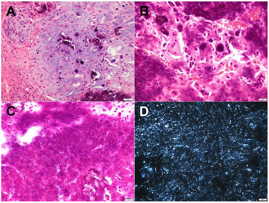 Histologically, the masses consisted of chondroid tissue with island-like or nodular deposition of basophilic crystals (Figure 6A). A foreign body granulomatous reaction was observed in some areas around the crystal deposition (Figure 6B). The crystals appeared rhombus or needle shaped and showed weak birefringence under the polarized light microscopy (Figure 6C,D).