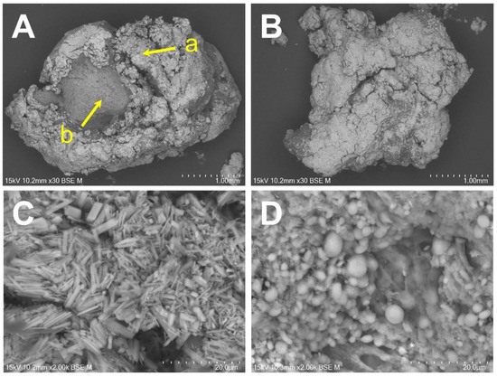 Scanning electronic microscopic images of the masses from the joint cavities. Masses were extracted from the (A) upper and (B) lower joint cavities (30×). (C,D) present the 2000× high power fields of (A-a) and (A-b), respectively.