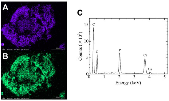 Elemental distribution images of (A) Ca and (B) P. (C) The EDS spectrum for the entire specimen (from Figure 6A) obtained by SEM/EDS.