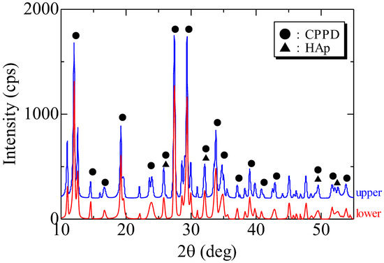 Most diffraction peaks of both crystals were assigned to those of CPPD, and a few small peaks were assigned to those of hydroxyapatite (HAp). Therefore, the main crystal was CPPD (Figure 9).