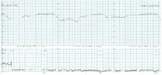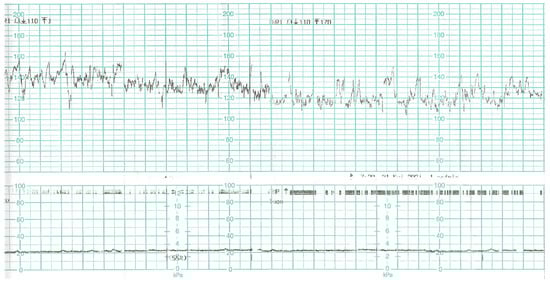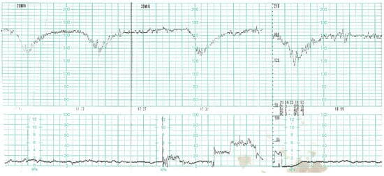 While waiting for the results of laboratory tests, a control cardiotocographic (CTG) recording was made. During the CTG recording, the foetal heart rate was found between 140 and 160 bpm. Within approximately 25 min of recording, reduced short-term variability with single decelerations and no acceleration was found—a pathological record that may suggest foetal hypoxia (Figure 1).