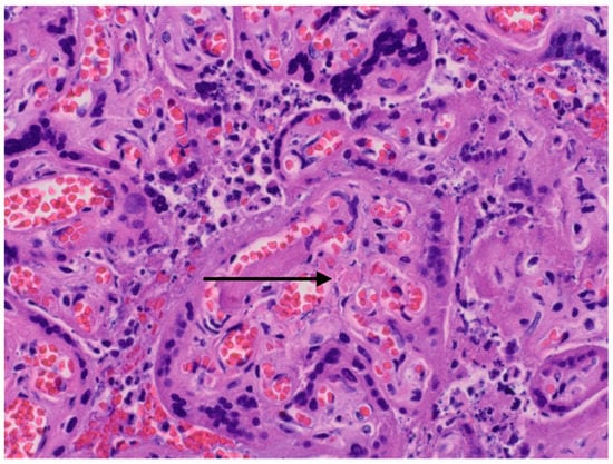 Histopatological images. Arrow—fibrin deposits.