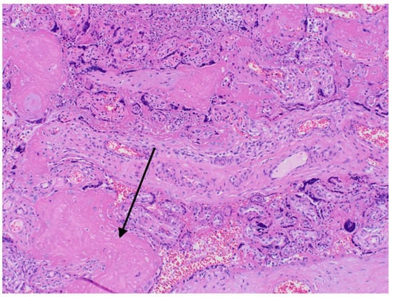 Histopatological images. Arrow—small infarcts.