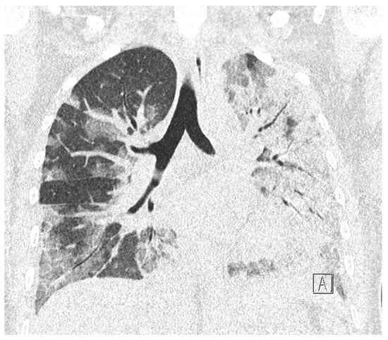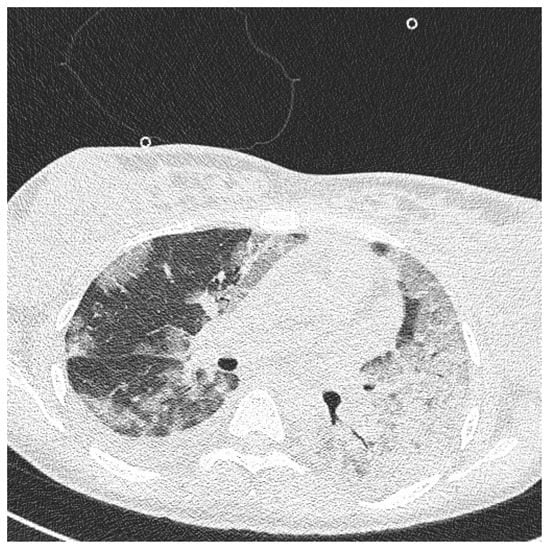 On the day of caesarean section, the patient’s vital parameters were: BP 130/80 mmHg, HR 110 bpm, Sat. 96%, breaths 20/min. Laboratory tests showed persistent abnormal clotting parameters. The drainage from the pelvis was 800 mL of blood, and in the control abdominal ultrasound examination the subcutaneous haematoma was observed. Due to the above, the patient was qualified to the relaparotomy and pelvic revision. During the procedure, another 2 g of fibrinogen, 2 units of platelet concentrate and 2 units of packed red blood cells were given. During the next two days, the patient was monitored in a postoperative room. Stable laboratory test values were obtained. Table 1 summarises the results of the patient’s examinations. A CT scan of the chest was performed. Massive converging zones of bubble densities in the type of frosted glass and paving stones, suggesting viral inflammation (typical for SARS-CoV-2 infection) were visible—see Figure 4 and Figure 5. Due to the gradually increasing respiratory failure (saturation 90%, and hypoxia—pO2 54 mmHg in a control arterial probe), high-flow nasal oxygen therapy was started. The satisfactory effect was not achieved. Sedation, intubation, and mechanical ventilation was initiated. After initial stabilisation the patient was transferred to the Intensive Care Unit, where she stayed for 8 days until improvement in oxygenation was achieved. She was successfully extubated and transferred to the Maternity Ward, from where she was discharged on the 22nd day of hospitalisation in good general condition.