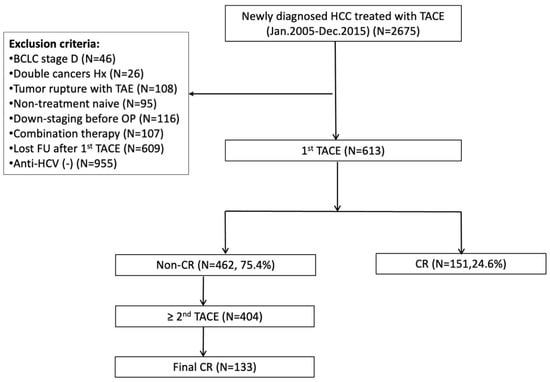 Flowchart of patient recruitment. BCLC, Barcelona clinic liver cancer; CR, complete response; FU, follow up; HCC, hepatocellular carcinoma; HCV, hepatitis C virus; Hx, history; OP, operation; TACE, transarterial chemoembolization; TAE, transarterial embolization.