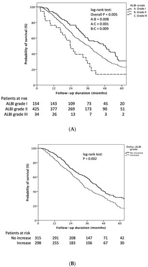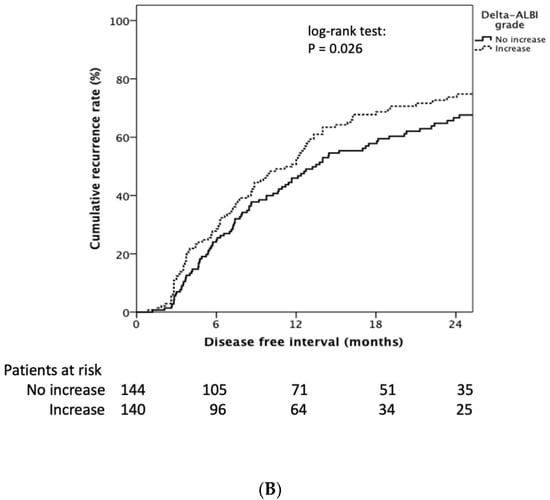 The following supporting information can be downloaded at: https://www.mdpi.com/article/10.3390/diagnostics12030665/s1, Figure S1: Kaplan–Meier estimates of survival rate stratified by delta ALBI grade in ALBI grade II (S1A) and ALBI grade I (S1B) patient; Figure S2: Kaplan–Meier estimates of recurrence rate stratified by delta ALBI grade in ALBI grade I (S2A) and ALBI grade II (S2B) patient.