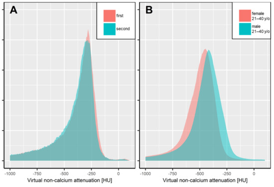 Statistical analysis was performed in the R language for statistical computing (version 4.0.0, R Foundation, Vienna, Austria). For further analysis, bone marrow attenuation histograms were normalized to a standard volume. Attenuation values below −1000 HU in the bone marrow space were not respected, since they appear due to VNCa postprocessing of densely calcified structures (e.g., cortical bone islands, segments of cortical bone), which do not contain bone marrow [23]. Attenuation histograms were reported by patient age, sex, and the level of calcium suppression (low, medium, maximum). The intraindividual consistency of our automated method was assessed by the percentage overlap of attenuation histograms at two consecutive examinations. Similarly, the age- and sex-specific bone marrow attenuation profiles were compared by the overlap of attenuation histograms (Figure 2). Figures were plotted using the R library ggplot2 [30].