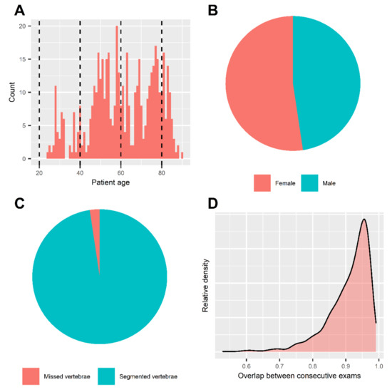 Summary statistics and patient characteristics. Histogram of patient age (A). Mean age of included patients was 61.0 ± 15.9 years. Dashed lines represent the borders of age subgroups for further analysis. Pie chart of patient sex (B). Patient sex was balanced in our dataset, including 88 females vs. 80 males. Pie chart of automated segmentation results (C). We achieved segmentation of 97.6% (n = 8298) of all included thoracolumbar vertebrae in our sample (n = 8500). Density chart of attenuation histogram overlap (D). Intraindividual consistency of our method was assessed by the overlap of attenuation histograms in consecutive exams. Median overlap was 92.9% [87.8–95.6]. 92.9% of follow-up examinations yielded at least a “good” and 65.3% an “excellent” intraindividual consistency (overlap > 80.0% and >90%, respectively).