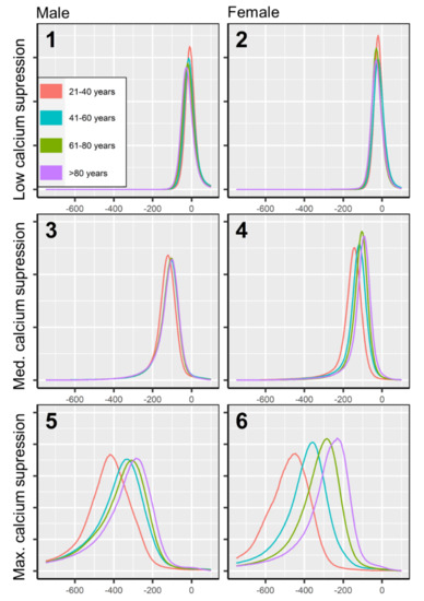 Bone marrow attenuation distribution was not uniform but varied depending on patient age and sex. The largest spread of bone marrow attenuation profiles was observed in the maximum calcium suppression index (Figure 4), which is the most frequently used VNCa setting for bone marrow imaging in recent literature [12,23]. In higher calcium suppression levels, bone marrow attenuation was found generally lower in younger age. The age-adjusted, sex-related differences in bone marrow attenuation were less pronounced (Figure 5).