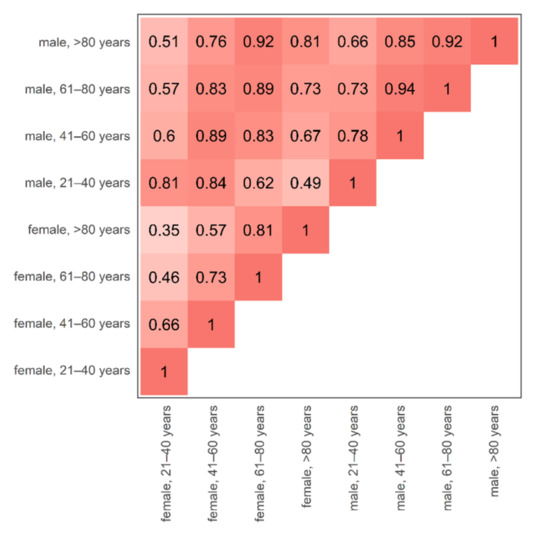 Cohort triangle of the age- and sex-specific discrepancy of bone marrow attenuation profiles. The changes in bone marrow attenuation profiles were assessed by the overlap of volume-standardized, average, virtual non-calcium attenuation histograms between all possible age- and sex-specific combinations. A high overlap of attenuation profiles is plotted by a darker shade of red. The largest discrepancy (=smallest overlap) was observed between the youngest vs. the oldest included female individuals (female, 21–40 years vs. female, >80 years, overlap 0.35). Inter-sex, age-adjusted overlap of female vs. male bone marrow attenuation was relatively high (0.81–0.89). It is worth noting that for reasons of simplicity, the bone marrow attenuation is compared at maximum calcium suppression level since this setting demonstrated the largest spread of attenuation profiles and has been described as most valuable for the diagnosis of bone marrow disease [12,23].