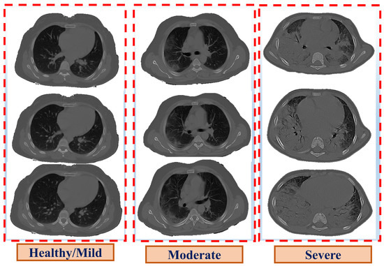 At the end of 2019, a new infectious disease, named Coronavirus Disease 2019 (COVID-19), emerged in Wuhan, China, and spread throughout the world [1]. The incubation period for COVID-19 (i.e., the time between exposure and the symptoms) is two to fourteen days, and symptoms often appear on the fourth or fifth day [2]. The symptoms of COVID-19 differ from one person to another based on the severity level of the disease. Many people infected with COVID-19 have mild to moderate symptoms and recover without the need for hospitalization, unlike severe symptoms that require mechanical ventilation, which may lead to death. However, it is possible to have a COVID-19 infection without showing any symptoms [3]. According to the Centers for Disease Control and Prevention (CDC), of COVID-19 cases are asymptomatic [4] while COVID-19 prevalence [5] was estimated at million with a mortality rate. COVID-19’s symptoms are classified into three categories [6]: mild, moderate, and severe; their symptoms are discussed in [7]. Severe disease is characterized by severe pneumonia, causing significant respiratory compromise and hypoxemia, requiring supplemental oxygen, and hospitalization, and can progress to pulmonary fibrosis (lung scarring), shock, and death [7]. Therefore, early diagnosis and grading of COVID-19 infection is vital to prevent any health complications and, thus, reduce the mortality rate. Several radiological modalities, such as Computed Tomography (CT), which is the most effective tool used to detect lung anomalies, particularly in its early stages [8,9], are employed as assistive toold in diagnosing the severity of COVID-19, ranging from the plain chest or the patchy involvement of one or both lungs in the mild or moderate cases, to a pulmonary infiltrate, called white lung, in extreme cases [10], as presented in Figure 1.