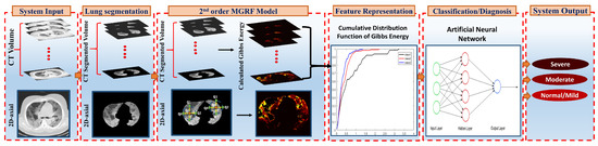 To achieve the main goal of this project, we proposed the CAD system that is shown in Figure 2. This CAD system consists of three major steps: (i) extracting the lung region from 3D CT images; (ii) developing a rotation, translation, and scaling invariant MGRF model to learn the appearance model of the infected lung region for a different level of severity (mild, moderate, and severe); and (iii) developing a Neural Network (NN)-based fusion and diagnostic system to determine whether the grade of lung infection is mild, moderate, or severe.