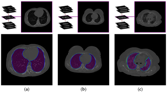 An illustrative example of the proposed segmentation approach for (a) healthy/mild, (b) moderate, and (c) severe COVID-19 infections. Note that the blue (green) border represents our segmentation (ground truth).