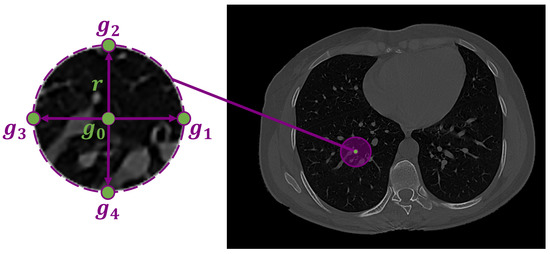 The infected region in the lung tissues is represented by the pixel-wise Gibbs energy of the proposed high-order MGRF. This Gibbs energy is computed by summing the potentials across all characteristic cliques for each pixel in the test subject. The proposed high-order MGRF model is based on using a heuristic fixed neighborhood structure (circular shape) to model the COVID-19 lung lesions. Figure 4 shows the high-order neighborhood structure with signal configurations: . B denotes the binary ordinal interactions,