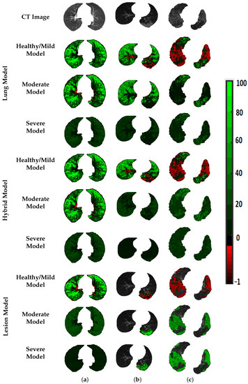 An illustrative color map example of Gibbs energies for (a) healthy/mild, (b) moderate, and (c) severe; tuned using healthy/mild, moderate, or severe COVID-19 lesions; applied to the lung (th rows), hybrid (th rows), and lesion (th rows) approaches.