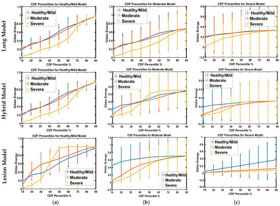 To prove that the results shown in the previous tables are not coincidental, the estimated Gibbs energy is represented by a color map, see Figure 6. As demonstrated in the figure, Gibbs energy for each grade is higher than the other two grades when the model is tuned using the same grade. For example, Gibbs energy for the healthy/mild case is higher than that of the moderate and severe cases when tuned using healthy/mild cases, and applied to the lesion model. The same goes for moderate and severe MGRF tuning. This shows the reported results in recognition of three grades, especially when applied to the lesion model. Since there are variable resolutions of the CT images in the dataset, we employed CDF percentiles as novel scale-invariant representations of the estimated Gibbs energy, acceptable for all data collection techniques. Figure 7 shows the average error of the CDF percentiles for three grades when tuning MGRF parameters using healthy/mild and moderate and severe lesions, applied to the three models: lung, hybrid, and lesion models. As shown in the figure, the CDF percentiles of the proposed system, when applied to the lesion model, are more separable than the other two models, demonstrating the efficiency of the lesion model compared to lung and hybrid models. This establishes the attainable accuracy of the proposed lesion model.