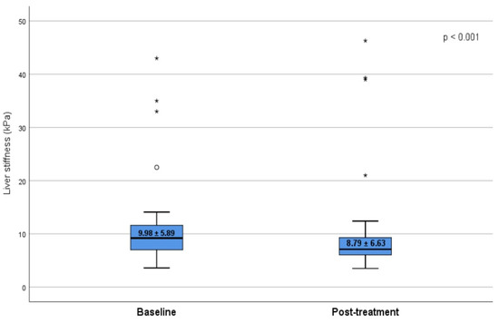 Figure 1. Changes in the LSM values after DAAs therapy. The bottom and the top of each box represent the 25th and 75th percentiles, while the lines through the box indicate mean value. The errors bars indicate the 10th and 90th percentiles, excluding asterisk (*). LSM, liver stiffness measurement.