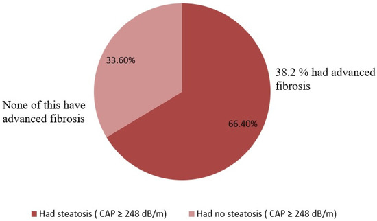 The patients with steatosis had higher LSMs (7.1 ± 1.5 kPa; SVR12- 8.3 ± 3.8 kPa, p = 0.038), while patients without steatosis did not have higher LSMs (7.5 ± 1.4; SVR12 5.5 ± 1.2 kPa, p < 0.0001) (Table 2). Thus, 38.2% of the patients with steatosis had advanced fibrosis (F3), while patients without steatosis did not have advanced fibrosis (Figure 3). At SVR12, both weight and BMI increased in patients with steatosis (73.1 ± 11.21 kg vs. 85.05 ± 10.4 kg, p = 0.006, respectively, 25.19 ± 5.17 kg/m2 vs. 29.23 ± 4.51 kg/m2, p = 0.003). The levels of transaminases decreased in patients with or without steatosis, including ALT (45.6 ± 50.8 U/L to 20.3 ± 4.5 U/L in patients with steatosis, p < 0.0001, and 57.78 ± 42.1 U/L to 19.4 ± 12.5 U/L in patients without steatosis, p < 0.0001, respectively); AST (36.3 ± 35.6 U/L to 18.3 ± 4.4 U/L, p < 0.0001, and 71.3 ± 58.7 U/L to 21.8 ± 10.8 U/L, p < 0.0001, respectively); and alkaline phosphatase (81.4 ± 42.1 U/L to 60.8 ± 24.5 U/L, p = 0.01, and 79.5 ± 22.8 U/L to 61.2 ± 18.4 U/L, p = 0.05).
